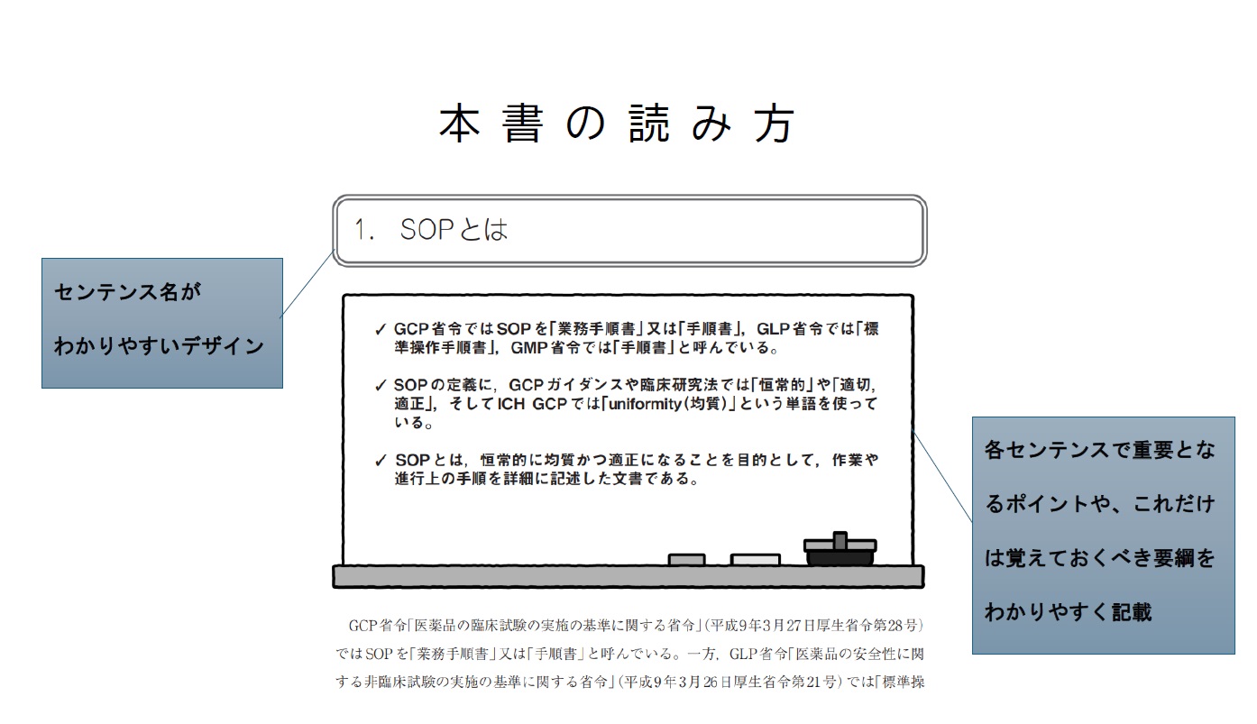 GCPやGLPあるいはGMPなどの,いわゆるGxPsといわれる規制要件で求められる基準において,必ずSOPを作成し遵守することが求められている。SOPは業務を適切に行うために読むものであるがゆえに,読み手にとって理解しやすい文章で作成されていなければならない。